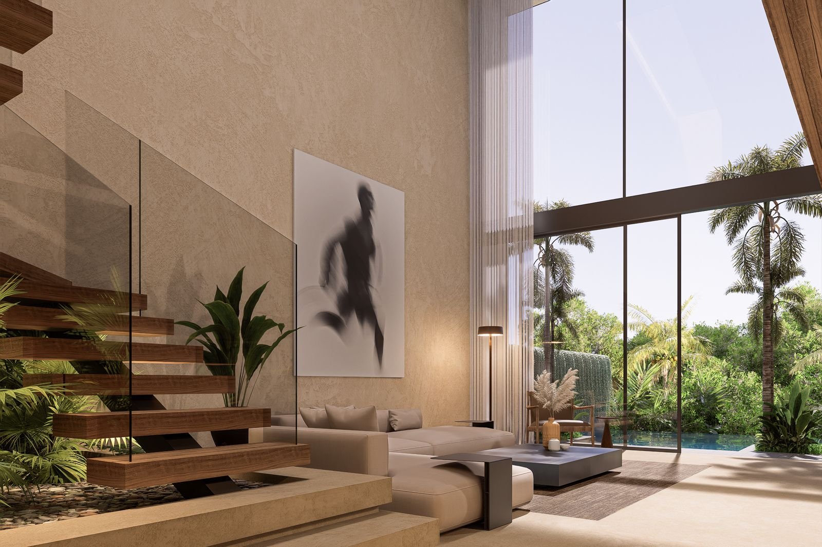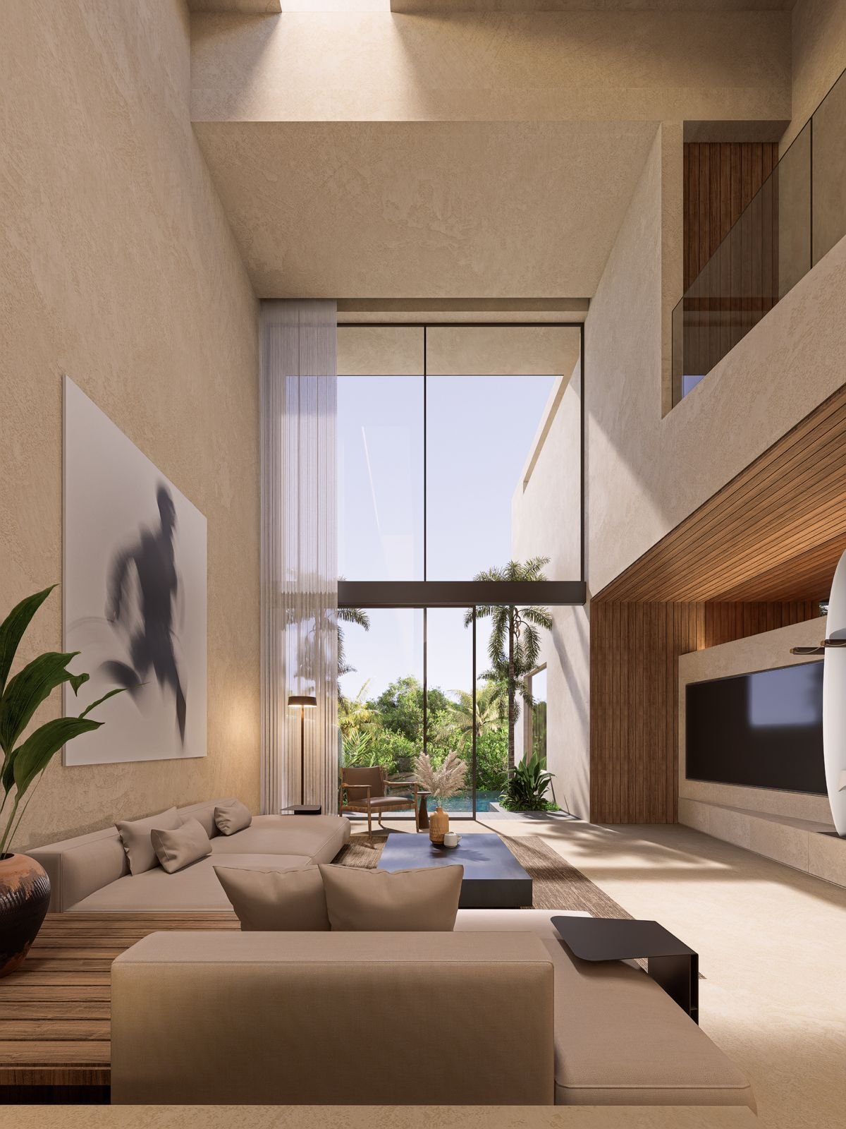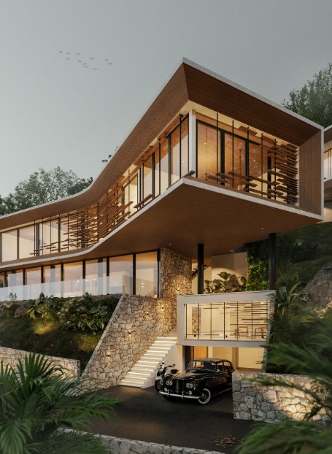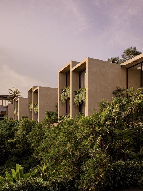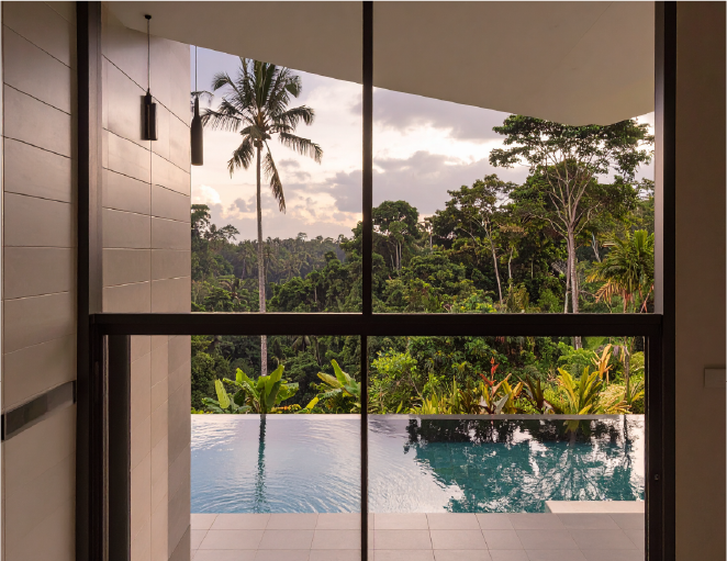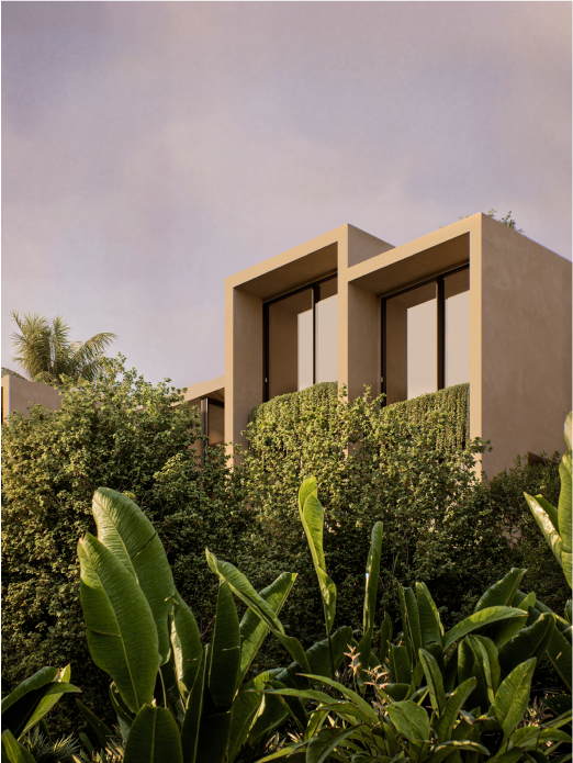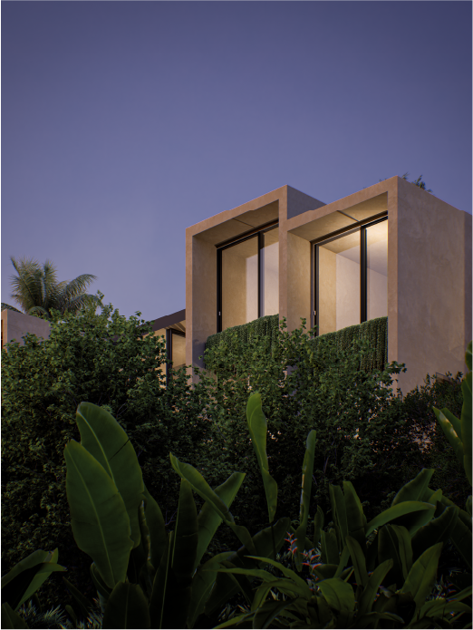ROOTED IN TROPICAL MINIMALISM, THE VILLAS RISE AS AN EXTENSION OF THE EARTH, CARVED INTO THE HILLSIDE TO FRAME UNINTERRUPTED VIEWS OF JUNGLE AND OCEAN. FLOATING TERRACES, DEEP OVERHANGS, AND REFLECTIVE GLASS DISSOLVE THE BOUNDARY BETWEEN INSIDE AND OUT, CREATING SPACES ATTUNED TO NATURE AND ALIGNED WITH THE MODERN TRAVELER.