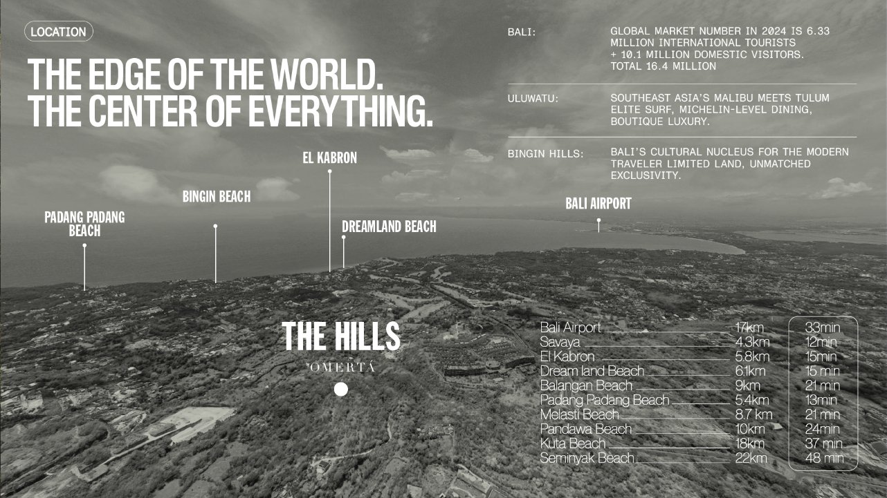 The masterplan and sales deck emphasize on-site wellness infrastructure including saunas and cold immersion therapy, proximity to Omertá’s private wellness sanctuary, and “deep work” zones, in addition to the Bingin Hills ridgeline location.