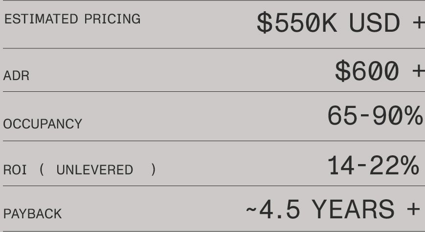 ROI modelling uses comparable Average Daily Rate and occupancy from the same micro-market, with three occupancy tiers at 65, 75, and 90 percent and three operating expense tiers 20,30 and 40 percent management and operations expense. Mid-case guidance shows about 16.4 to 18.5 percent unlevered ROI for the two-bedroom with payback about 5.4 to 6.1 years, and about 18 to 21 percent for the three-bedroom with payback about 4.9 to 5.5 years, depending on entry price.